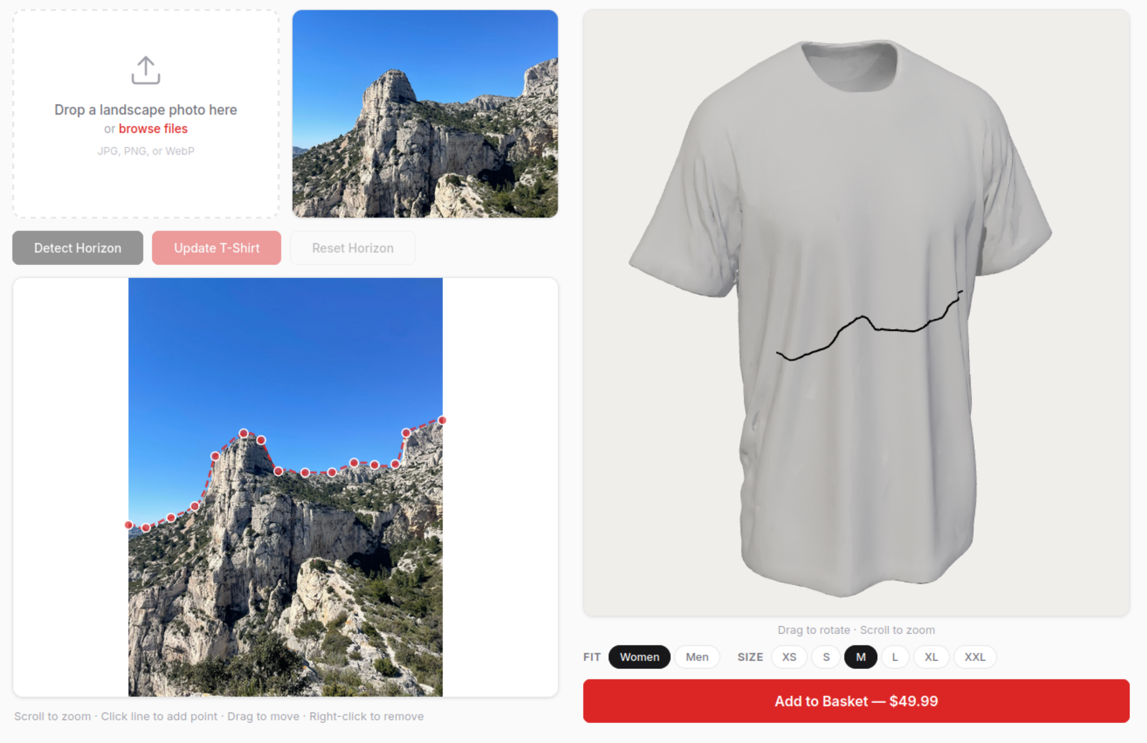 An online shopping website for personalized outwear. The landscape is automatically extracted from your horizon image (can be manually fine-tuned). The landscape line is then stitched to a T-shirt, with a 3D visualization, ready to order.
